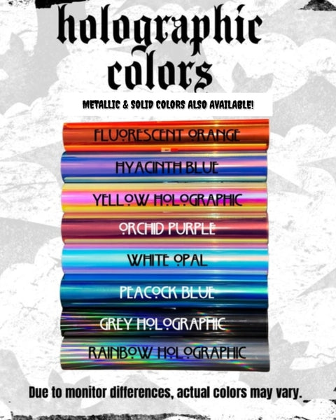 Tons of solid, holographic, and even some patterned vinyls such as leopard, cow print, etc. We have ALLLLLL solid colors - if you want a specific color, send me a picture that shows the color & I'll match it to the best of my abilities. We also have metallic colors such as gold, champagne gold, rose gold, sparkle rose gold, and silver.